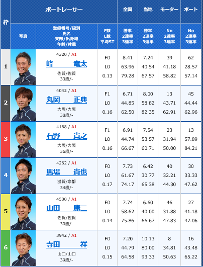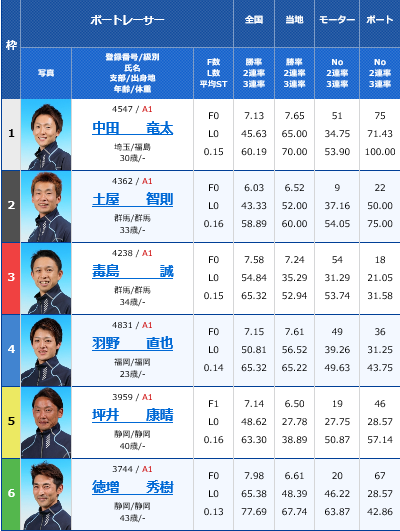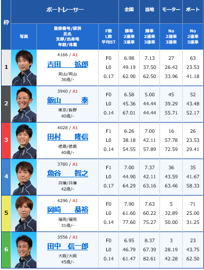 SGオーシャンカップ準優勝戦予想 2018年07月14日 ボートレース 0 オーシャンカップは早いもので4日間の予選を終えて、明日準優勝戦を迎えます。 前検日には田村や魚谷の復活優勝が見れるかもしれないとウキウキしていたのですが、田村は今節に限ったことではないのですが、なんか消化不良のレースばかりで、少しがっかりしています。 腕が落ちたとかは思いたくないのですが、昔の凄い田村を知ってる分なんか悲しくなりますよね。 まあそれは田村だけでなく、他の銀河系軍団にも言えることなんですけどね。 特に今回のオーシャンには出てないけど、湯川とかね。 森高はイン以外では、最初から買い目から外してるから、SGでは点数が減らせて楽なんですけどね。 魚谷は3日目の時点で1着3本、3着1本でこのまま予選1位通過するだけだと思っていたんですが、今日の4日目で大きく得点を落としてしまいました。 魚谷はどんなレースでも決して手を抜いたり妥協したりせず、真面目な人間なのでずっと応援してます。 まあ田村にしろ魚谷にしろ予選を通過してるので、まだまだ優勝のチャンスは大いにあるので、せいいっぱい応援したいです。 しかしながら、私情は抜きにして、きちんと予想をしたいと思います。 ▼9R 準優勝戦 このレースは1枠から4枠まで良いモーターの選手が揃いました。 先程名前を挙げた田村と魚谷もそうですし、飯山のモーターも良い。勿論1枠のカクローのモーターも良いです。 進入はタナシンが動いたとしても、みんな内には入れないと思いますので、枠なりでしょうね。 それでは、私の買い目です。 3連単 ①→④→⑤③⑥ ①→⑤→④ ④→①⑤→①⑤⑥ ⑤→①④→①④⑥ 計12点でいきたいと思います。 本線はカクローの順当逃げだと思いますが、好モーターの魚谷がやはり怖い。 魚谷が攻めた時に展開が外に向くと思いますので、ズバット岡崎の捲り差しが入りそうな気がします。 結果的に12点になりましたが、①④⑤の3連単BOXにはドカーンと買いたいと思います。 ▼10R 出走表 このレースも進入が鍵になりそうですが、徳増が動くんですかね? 仮に入れても、4コースまででしょうね。 早速私の買い目です。 2連単 ①③→①③⑤ 計4点です。 機力なら中田と土屋の2名が抜けてます。インの中田信頼でも良いんですが、毒島の捲り差しも怖いので、一応毒島の頭も抑えておきたい。そしてアウトの坪井も一応2着までには抑えておきたいです。 本線①→③にがっつりいきたい所です。 ▼11R 出走表 このレースは枠なり進入でしょうね。 私の買い目です。 3連単 ①→③→②④⑤ ①→②⑤→③ 計5点 石野の頭とか丸岡の頭を狙おうとも考えましたが、正直言って厳しいように思ったので、ここは絞って峰の1着固定でいきたいと思います。 石野の3コースは買えるので、なんとか2着にきてほしいです。